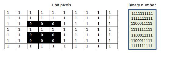 The image below shows each 1 bit pixel containing either binary 1 or binary 0.